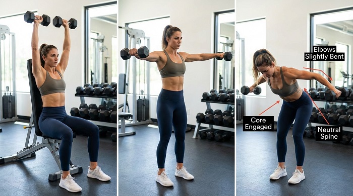 Ready for the grand finale? This three-part movement will hit your shoulders from every angle. Start with a front raise, flow right into a lateral raise, and finish strong with a rear delt raise. Think of it like painting your shoulders in 3D!